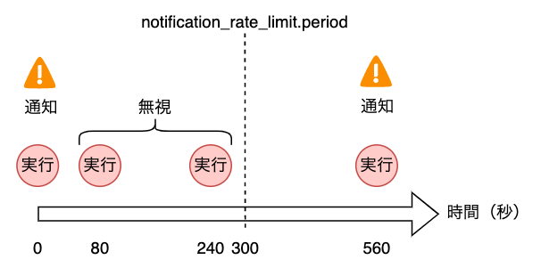 alert_strategy.notification_rate_limit.periodもログベースのアラート特有の設定です。アラート発報後、指定した時間内はクエリに該当する新しいログがあっても無視する機能です。今回の例では300sで設定しているので、3回の実行は1つの通知でまとめられます。4回目の再実行は再度通知が来ます。本来であれば4回目の通知は受け取りたくないので、periodを長くすることが必要です。メトリクスのアラートではインシデントがオープン中はconditionを満たしていても再通知されませんが、ログベースのアラートではインシデントがオープン時でも再通知がくるのが特徴です。