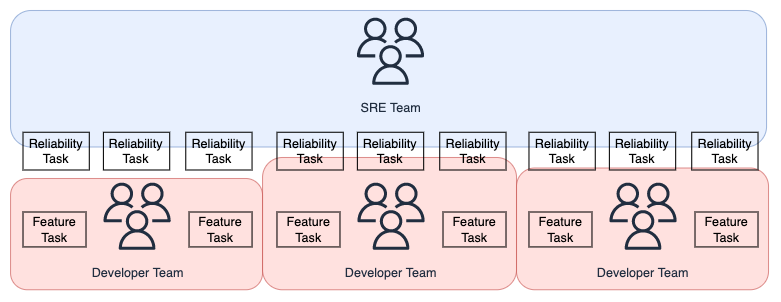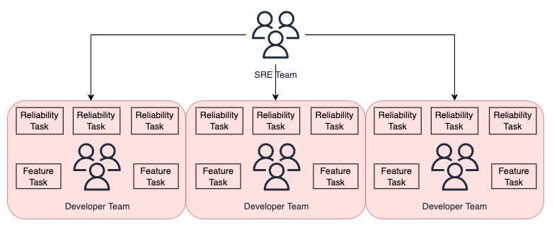 信頼性に関するタスクの大部分をSREチームが対応しているフェーズです。例えば、開発チームが本番の変更などをする際にもSREの承認が必要で、SREチームが門番となってしまっている状況になります。このフェーズでは必要最低限の信頼性は担保されている一方で、SREチームがボトルネックとなり信頼性向上の効率が下がり始めます。SREチームは各開発チームからの依頼対応に追われ、信頼性の更なる向上に取り組めなくなります。また、別の問題として開発チームが信頼性担保をSREチームに完全に任せてしまうことで主体性が欠けていき、信頼性低下の地雷を各所に埋め込み始める可能性もあります(EX: DBのパフォーマンスを考慮しないクエリ...etc)。